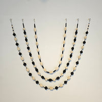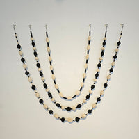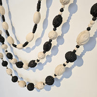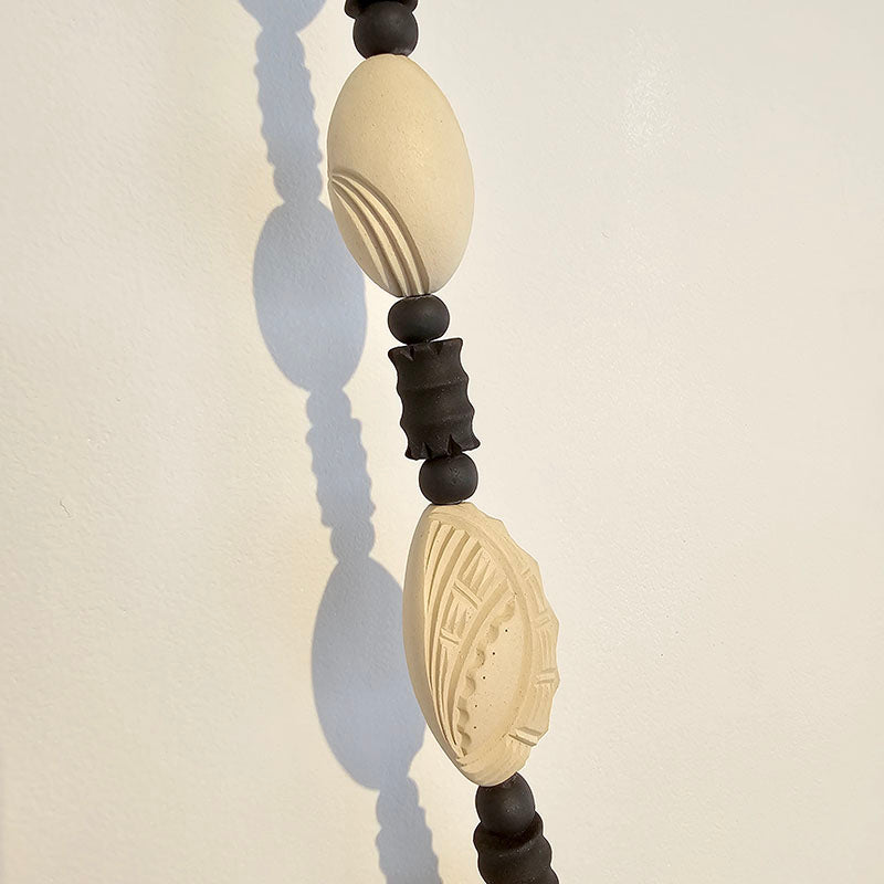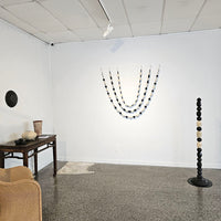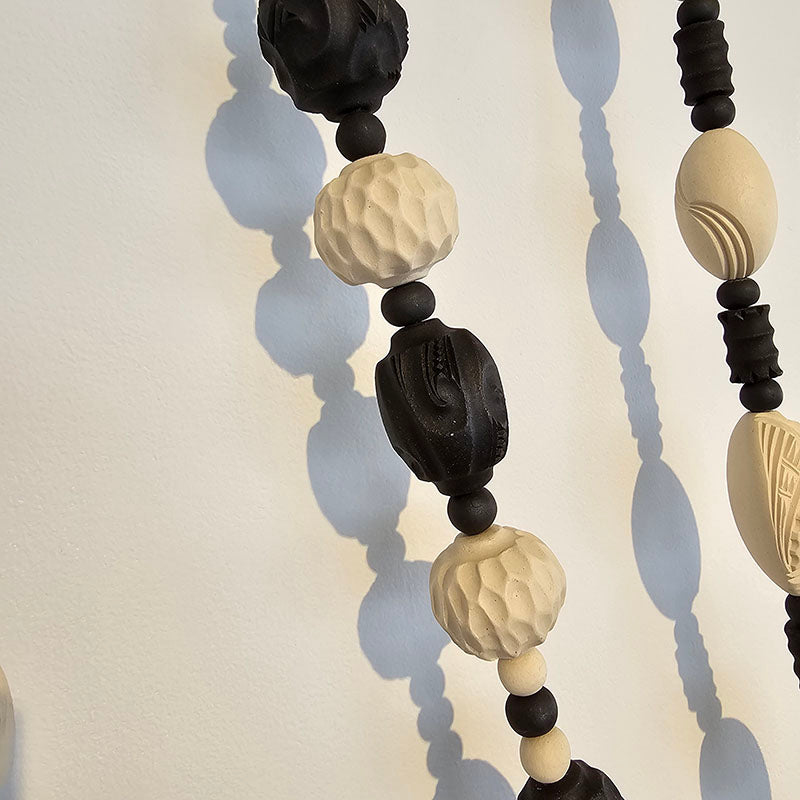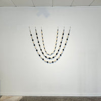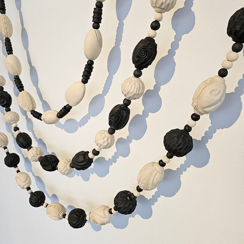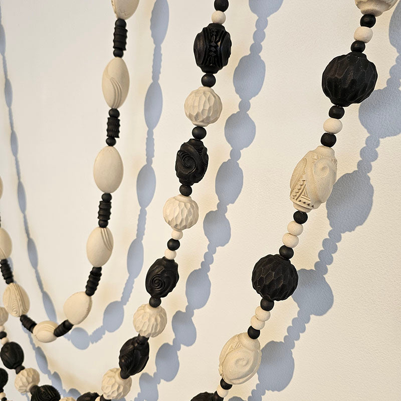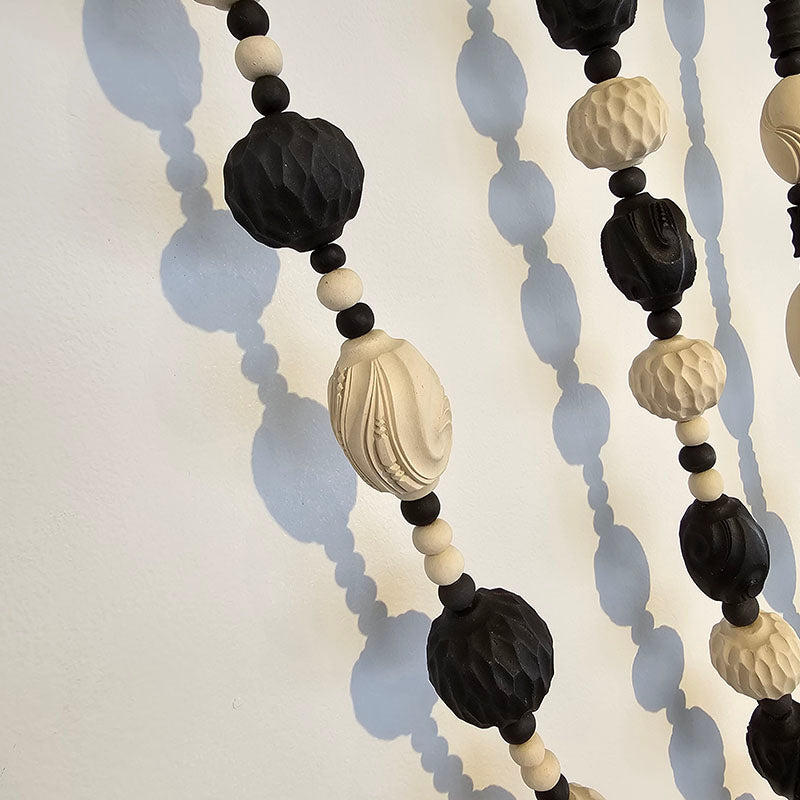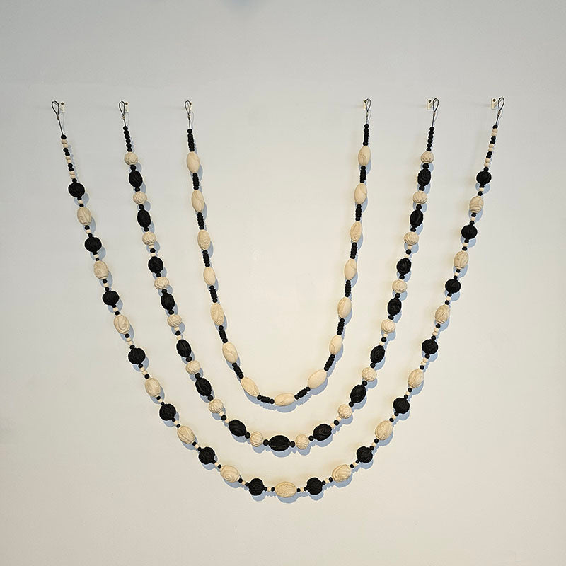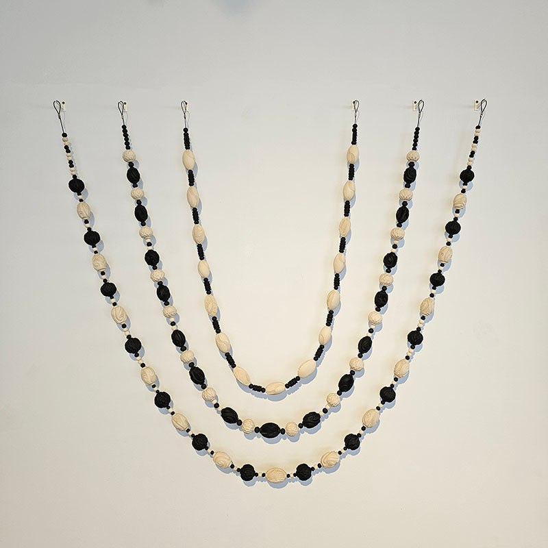 a 3 strand installation.black and white uku on steel wire; L1900 x 40mm, L2320 x 45mm, L2765 x 48mm; overall W1300 x H1200mm variable