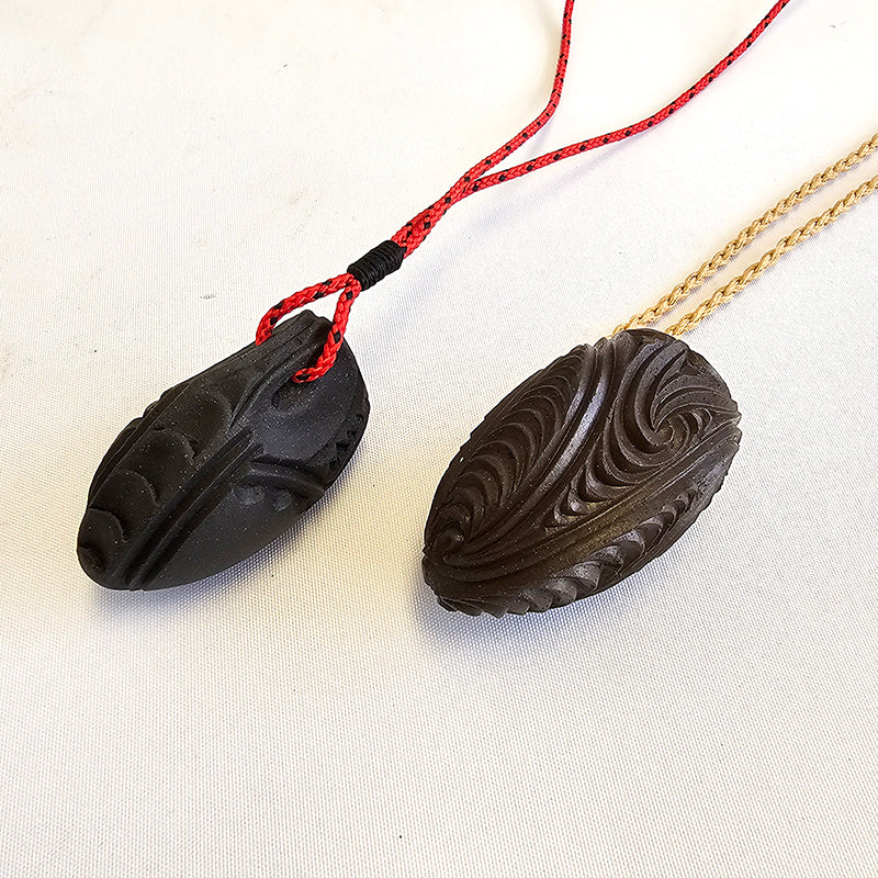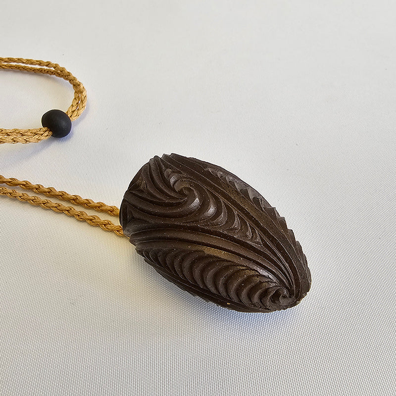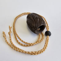 brown carved uku, plaited cord