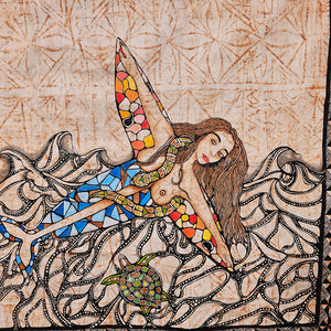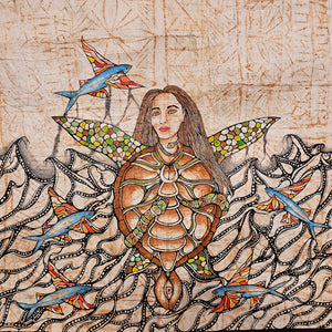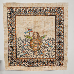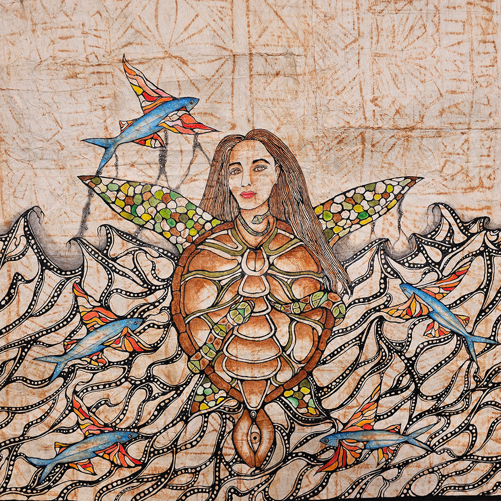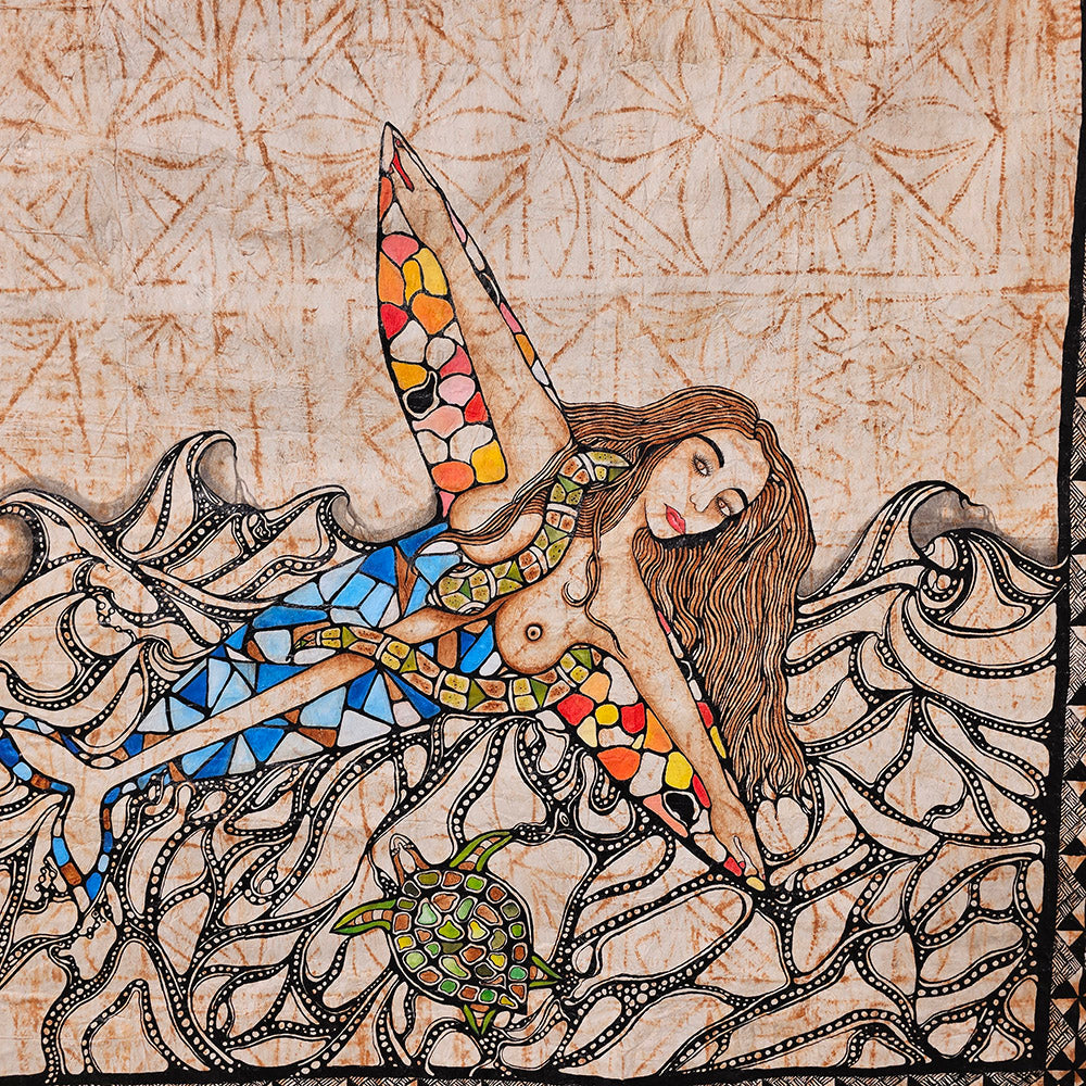 Sulieti Fieme’a Burrows and Tui Emma Gillies are a Tongan New Zealand mother-and-daughter team that make tapa cloth and are scholars of the art. The duo’s art manifests their shared passion and close relationship in a hybrid style harmonizing traditional tapa with contemporary elements. Apart from adding colour pigment onto designs that are customarily black and brown, their work also integrates themes that deviate from the standard of geometric grids and floral motifs, often featuring themes of femininity, nurturing, protection, and spirituality. Burrows and Gillies strive to utilize as many natural resources as they can in tandem with modern materials. Tapa cloth itself is entirely decomposable, and the glue they use to paste each piece together is mixed with tapioca starch, half-cooked until the texture’s right. Their main modern adaptations in creating tapa art include Indian ink and acrylic paint.