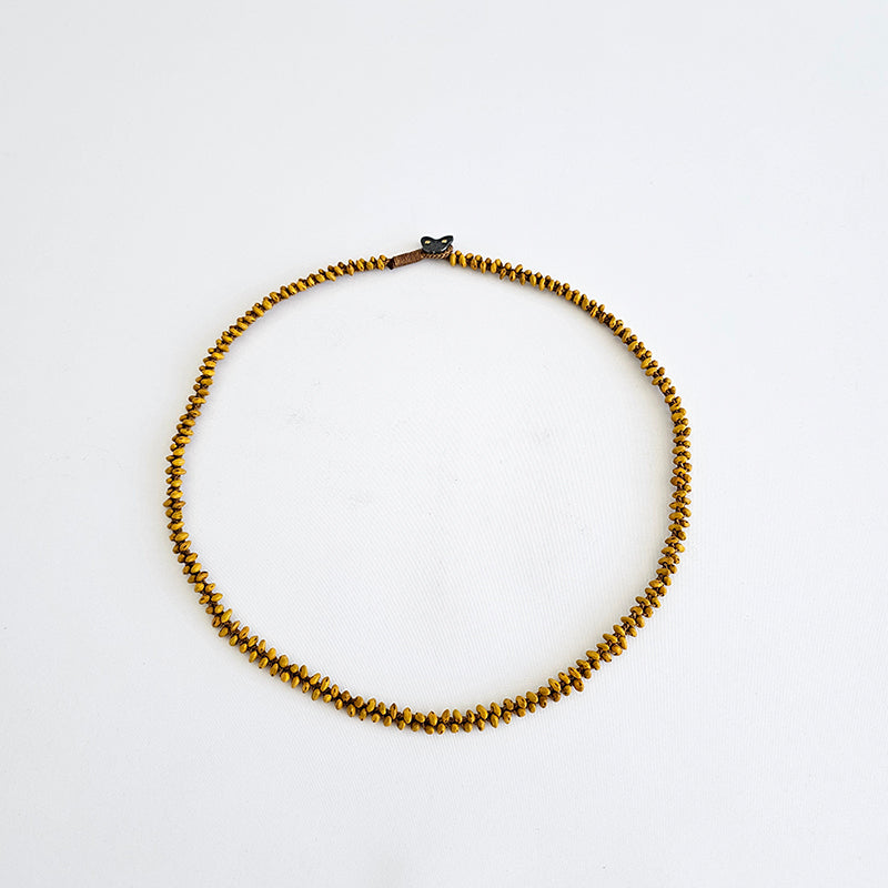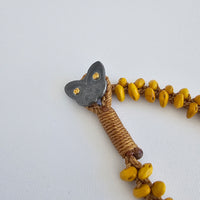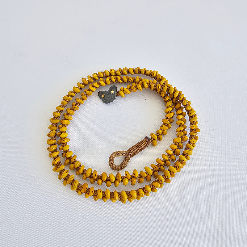 koruru catch, 80cm, Kakano kowhai, oxidised sterling, 24 karat gold, polyester cord.